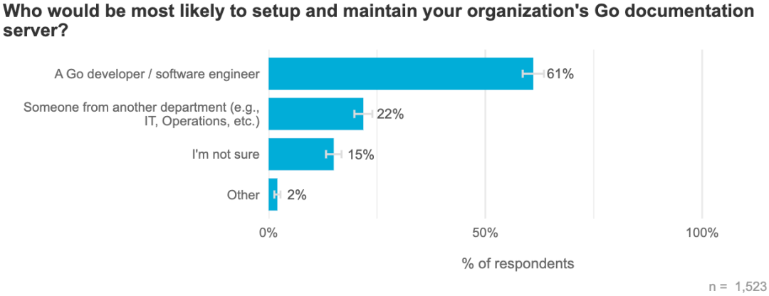 结果显示,目前最常见的内部 Go 文档查看方式是阅读代码(81%),其中约半数觉得这样就挺好,但也有 39% 认为能有内部文档服务器就更好了。我们还询问了这类服务器应该由谁配置和维护,有三分之二的受访者认为应该是软件工程师,余下三分之一觉得可以指派专门的 IT 支持或运营人员。从这个角度看,理想的文档服务器应该是那种交钥匙解决方案,或者至少不会带来过多的额外工作负担(一个人在午休时间就能维护好)。考虑到目前开发人才严重短缺的现实,这样的要求完全在情理之中。