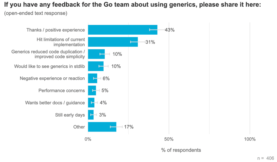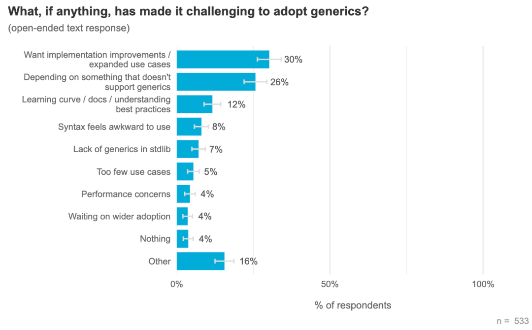 第二个理由则是某些依赖项尚不支持泛型——其中最典型的例子是 linter,此外还有仍在使用的早期 Go 版本,或者尚不提供 Go 1.18 包(26%)的 Linux 发行版等。12% 的受访者则是因为学习曲线陡峭或说明文档不充分而选择放弃。除了这些重要因素,受访者还反馈了一些相对不太常见、但仍有意见的阻碍,如下图所示。这里,我们仅列出已经在使用泛型,或者曾尝试使用泛型但未能成功的受访者。