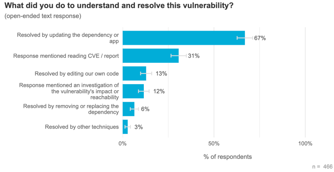 在意识到存在漏洞后,受访者们最常见的解决方法(67%)是升级相应依赖项。在使用漏洞扫描程序(专门用于检测第三方依赖项中漏洞)的受访者中,选择升级依赖项的比例则上升至 85%。近三分之一的受访者会阅读 CVE 或漏洞报告(31%),只有 12% 的受访者会进一步做深入调查,了解自己的软件是否受到影响、受到怎样的影响。