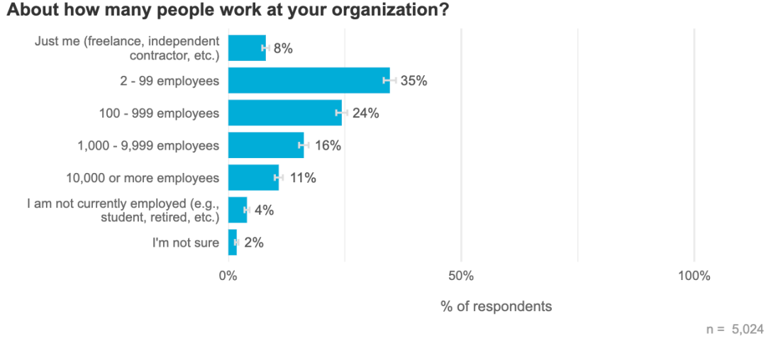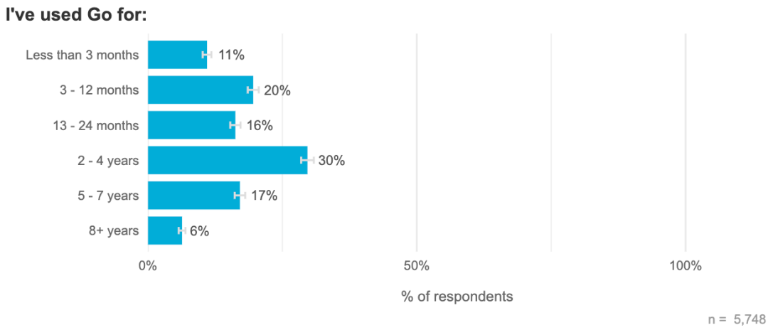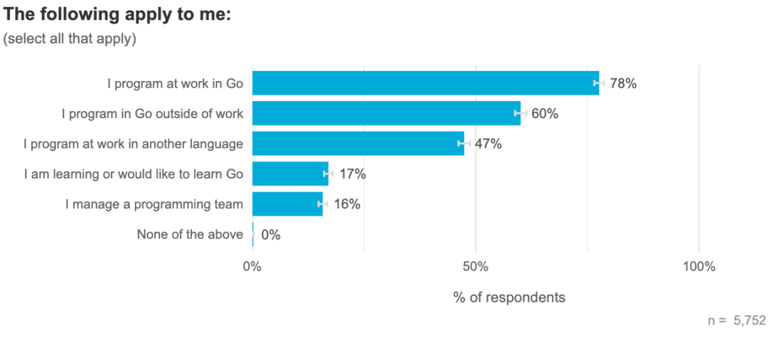 在本文中,我们将通过一系列图表来解读此番调查。所有图表均采用相同格式,标题部分是向受访者们提出的具体问题。 除非另有说明,否则各问题均为单选形式,受访者只能选择其一。图表的副标题部分,会标注是否为多选问题或开放性问题。对于开放性问题,Go 团队成员认真阅读并手动整理了受访者们的意见。大家对于这类问题的回应多种多样,因此我们挑选了最具共性的前十大主题,其余主题则被归类为“其他”。