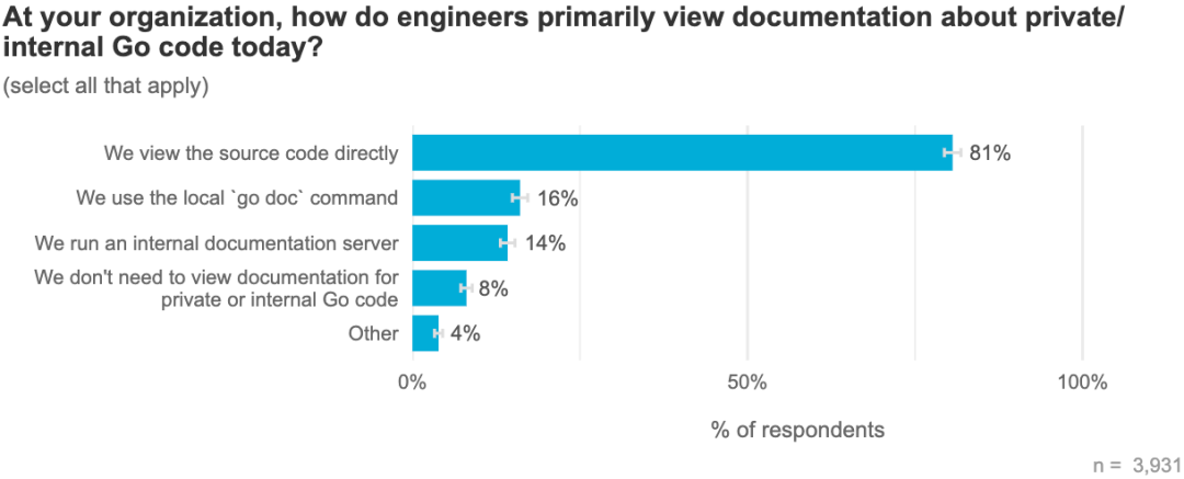 在 Go 模块发布之前,不少组织已经在通过内部文档服务器(例如支持 godoc.org 的服务器)为员工提供内部 Go 包文档。但现在,这类服务器的设置流程比以往更为复杂,我们也在考虑要不要投资来简化这个过程。因此,我们询问受访者如何查看内部 Go 模块文档,想了解这是不是他们的首选工作方式。