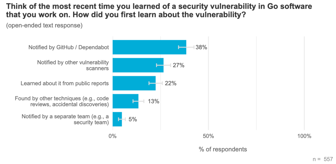大多数受访者(65%)表示,他们发现的漏洞源自安全扫描程序。受访者最常用的工具是 GitHub 的 dependabot(38%),使用比例高于所有其他漏洞扫描程序的总和(27%)。除扫描之外,受访者了解漏洞的其他常见方式还包括公共报告,例如发布说明和 CVE(22%)。