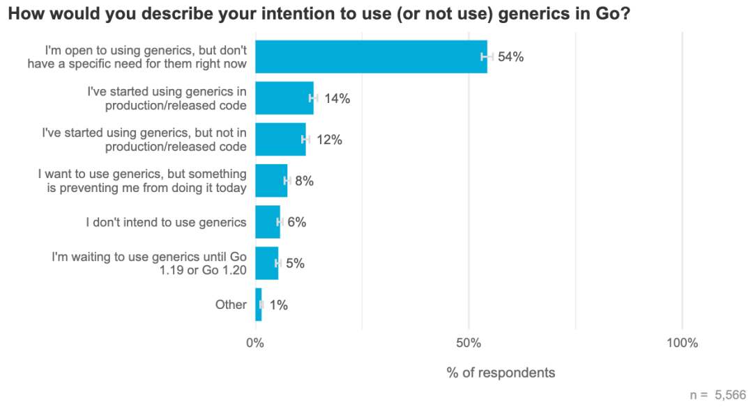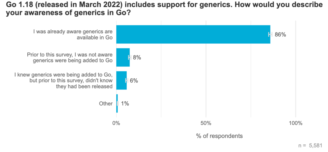 绝大多数受访者(86%)都知道 Go 1.18 版本引入了泛型。虽然我们预计这个比例会超过一半,但没想到有这么高。我们还发现,约四分之一受访者已经开始在 Go 代码中使用泛型(26%),其中 14% 表示是在生产或已发布的代码中使用。 大多数受访者(54%)并不抵触泛型,只是目前还没开始使用。** 另有 8% 的受访者有意在 Go 中使用泛型,但出于种种原因而暂未行动。