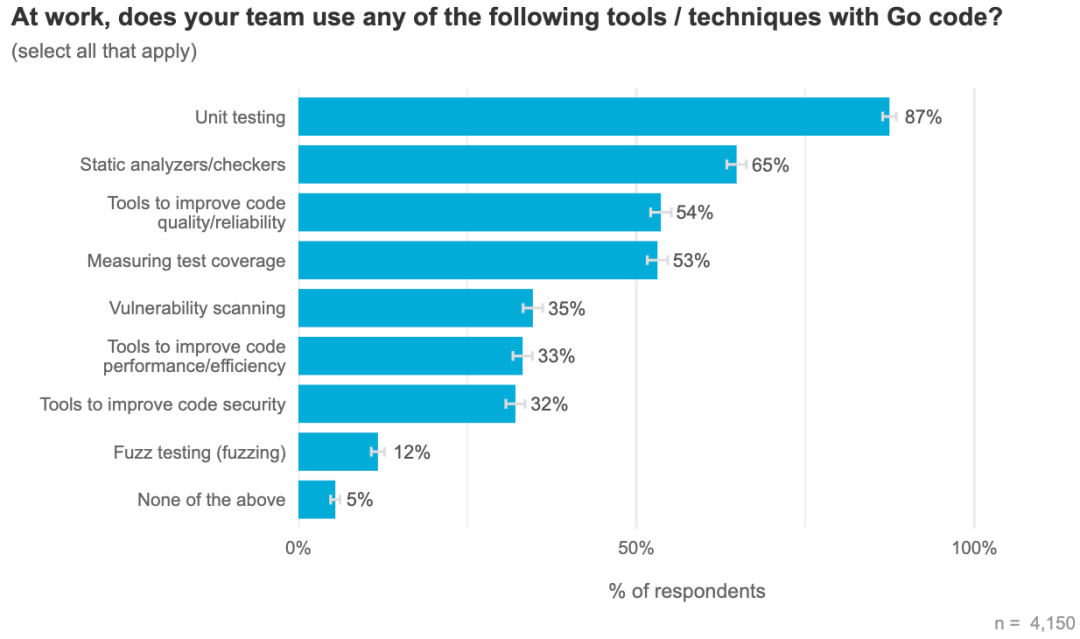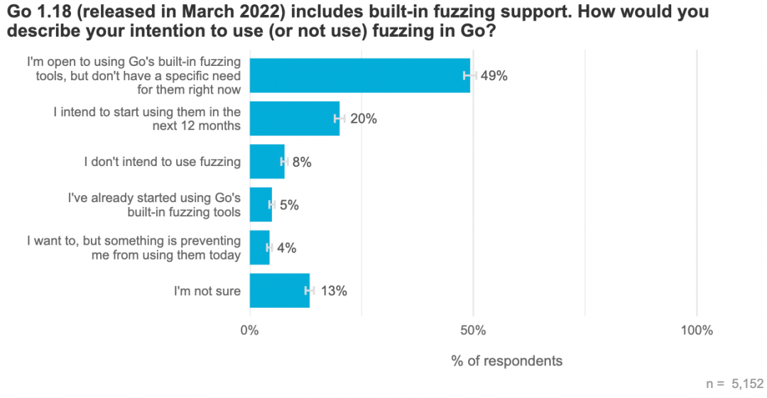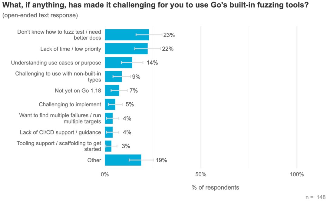 模糊测试是提高应用程序安全性的另一种好办法,但大多数受访者似乎对此还不熟悉。只有 12% 的受访者在实际工作中用过模糊测试,5% 的受访者称已经在使用 Go 内置模糊测试工具。 在“为什么会感觉模糊测试难以使用”的开放性问题中,我们发现影响最大的并非技术因素:占比最高的三个答案分别是“不了解如何使用模糊测试”(23%)、“没时间进行模糊测试或者其他安全保障工作”(22%)、“没法以符合预期的方式和时间进行模糊测试”(14%)。这些发现表明,我们还需要投入精力帮助开发者了解模糊测试的价值、模糊测试要测什么,以及如何把它应用在不同的代码库当中。