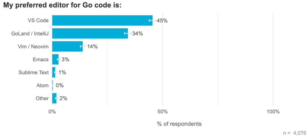 在 2021 年通过 gopls 语言服务器强化 VS Code 的 Go 支持能力之后,Go 团队一直想了解 gopls 中存在哪些使用痛点。虽然我们已经从开发者那边收到了不少反馈,但不清楚会不会有很多开发者直接禁用掉了这项功能。为了收集关于 gopls 的负面意见,我们专门统计了那些所使用的编辑器能够支持 gopls 的受访者(无论他们是否实际使用 gopls),并发现禁用比例只有 2%。而且在 VS Code 上,禁用比例更是下降至 1%。这让我们对 gopls 的表现更具信心,也期待大家在 GitHub 上提交更多关于 gopls 的问题。