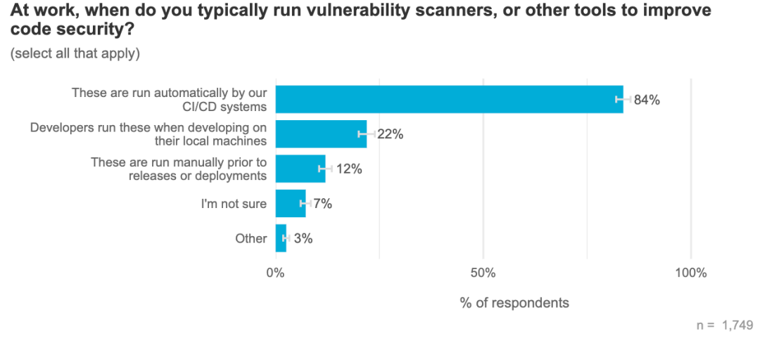 调查结果表明,虽然静态分析工具得到了广泛应用(65%),但只有少数受访者在使用这些工具发现漏洞(35%),或者以其他方式提高代码安全性(33%)。 受访者们表示,安全工具主要运行在 CI/CD 过程(84%),只有少数开发者会在开发期间运行这些工具(22%)。这与我们团队进行的其他安全研究一致,即安全扫描大多集中在 CI/CD 期间,而这时才关注安全问题其实为时已晚。更理想的方法,应该是在构建之前就知晓依赖项是否存在漏洞、验证版本更新是否解决了这些漏洞。等到 CI 针对 PR 运行完整测试时,隐患往往已经难以剔除。