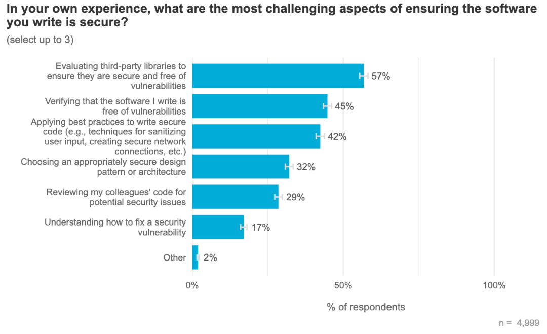 我们还向受访者询问了他们在安全开发软件时的最大挑战。目前最常见的难题是如何评估第三方库的安全性(57%), 其实主题漏洞扫描器(例如 GitHub 的 dependabot 或者 Go 团队的 govulncheck)就能很好地完成任务。其他反馈意见则为新工具提供了发展空间:受访者们表示,他们在编写代码并验证成果是否存在漏洞时,往往很难全流程遵循最佳实践。