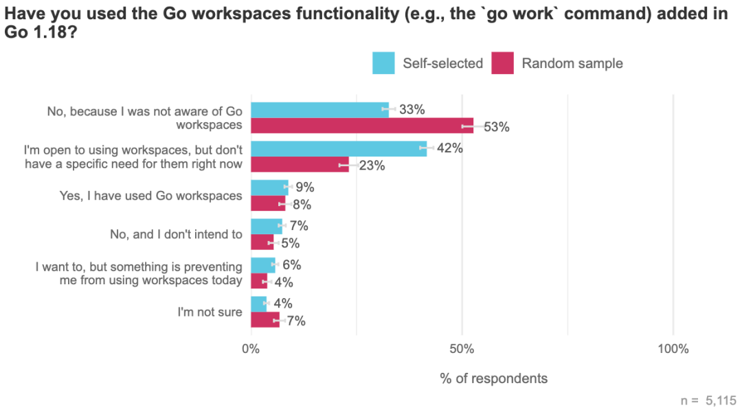 在工作区这边,很多受访者似乎是在本次调查中才知道 Go 能够支持多模块工作区。对 VS Code 用户的随机调查显示,大多数受访者从来就没听说过工作区(在随机抽样受访者中占比 53%,在自荐受访者中占比 33%)。其实对泛型的认知和接纳差异在这两个受访者群体间也体现得非常明显,分别为 93% 和 68%。也许是因为我们目前的 Go 博客或社交媒体渠道还不足以涵盖足够的 Go 开发者,所以很多新功能并不能有效传递至用户耳中。