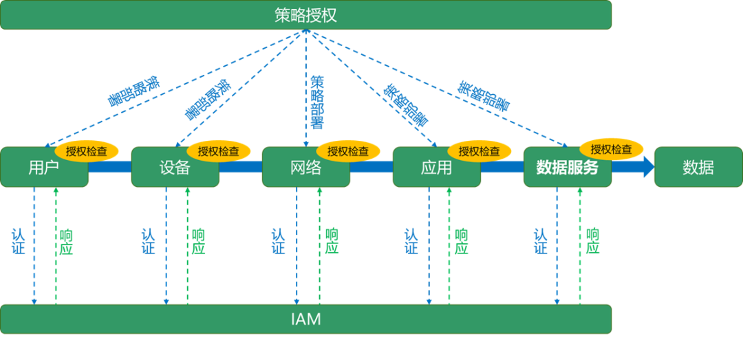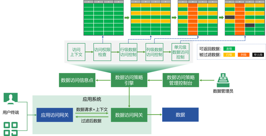从图中可以看到,有4道授权决策点,但考虑到第1道授权包含了人和设备两种情况,所以实际上可以展开成5道授权决策点。如下图所示:从上图可见,5道授权决策点依次是:用户->设备->网络->应用->数据。而通常意义上的零信任,主要是实现了前面的4道授权。而第5道数据授权,才是数据访问控制的核心。数据授权的基本原理如下图所示:数据访问控制与之前几道访问控制的重要区别在于:之前的几道网关都是功能级的访问控制;而数据访问网关是数据级的访问控制。数据访问网关通过数据访问策略引擎,实现数据库的表级、行级、列级、字段级的数据访问控制。这是其它的网关通常无法实现的能力,也是数据安全中最值得重视的能力。