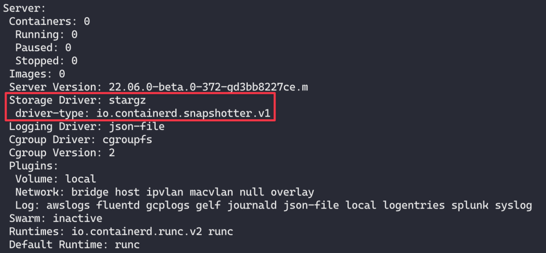在 Docker Desktop 的设置中启动 containerd 管理镜像后,运行 docker info 会发现存储的驱动从原来的 overlay2 变成了 containerd 的 stargz。