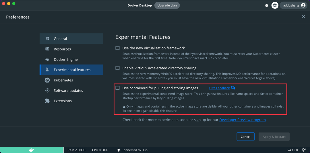 Docker 在刚刚发布的 Docker Desktop 4.12.0[1] 中,加入了实验特性:进一步集成 containerd,使用 containerd 来管理和存储镜像。