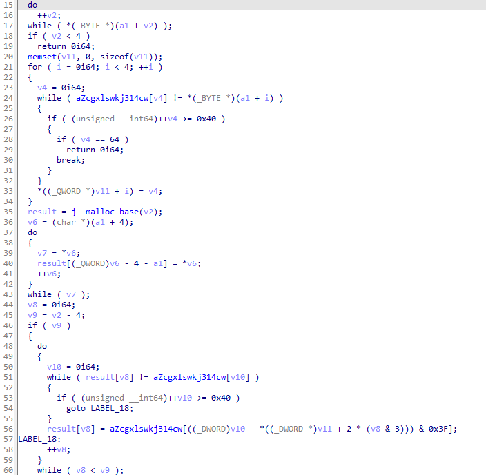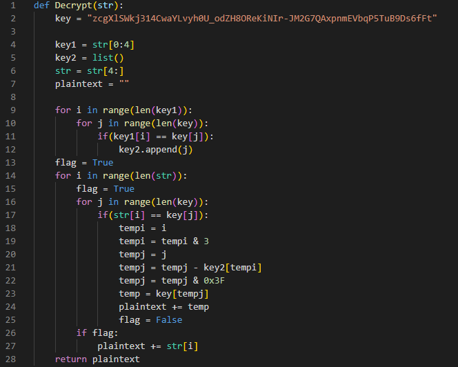 分析发现,该解密函数以及使用的Key与去年我们在《Kimsuky武器库更新:利用新冠疫情为诱饵针对韩国地区的攻击活动分析》【2】一文中披露的相同,使用类似base64的映射表来进行解密,其python版本的解密代码如下: