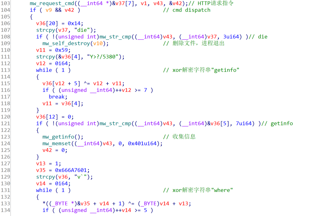 发送数据后,从C2接收指令执行,其指令功能如下: