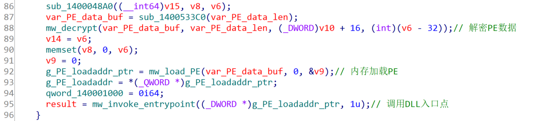 释放的DLL实际是个加载器,其入口点函数通过AES解密得到另一段DLL数据,然后直接内存加载并调用该DLL的入口点函数。