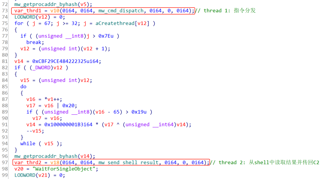 调用函数sub_18000AA70创建额外两个线程:一个线程向C2服务器请求指令并进行指令分发,另一个线程将CMD shell中的命令执行结果回传给C2服务器。