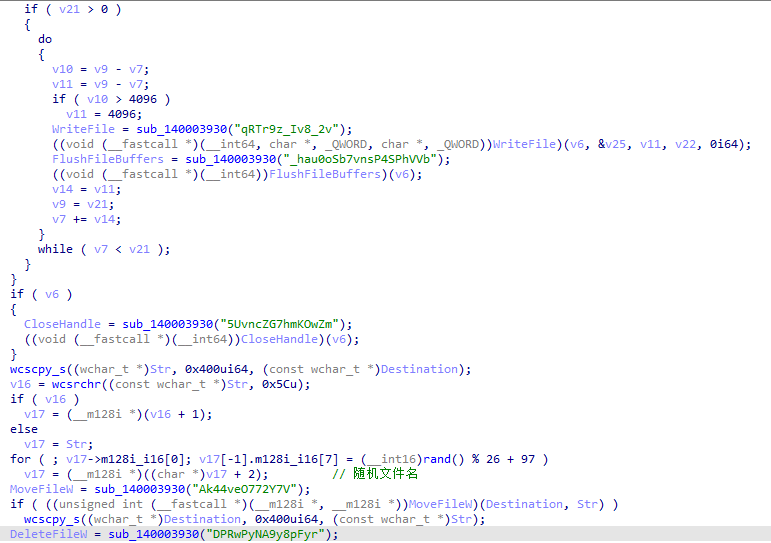 当启动参数为iFfmHUtawXNNxTHEiAAN时,首先隐藏错误显示框。然后判断参数个数,当大于等于3时,则会触发特定文件删除功能。写入大量空白数据,进行随机更名后删除文件。