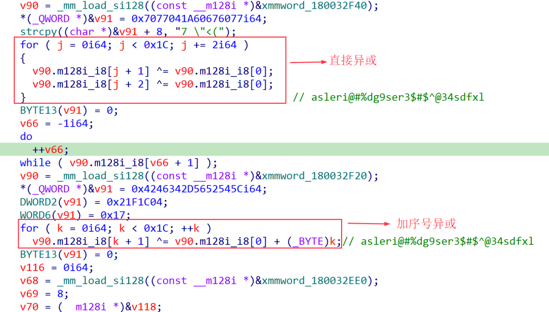 后门DLL中使用的字符串一般通过异或解密恢复,异或的key为字符串第一字节或前两字节(ASCII字符串的key为1字节,宽字符串的key为2字节)。异或方式有两种:一种是直接异或key,另一种是异或key与序号之和。
