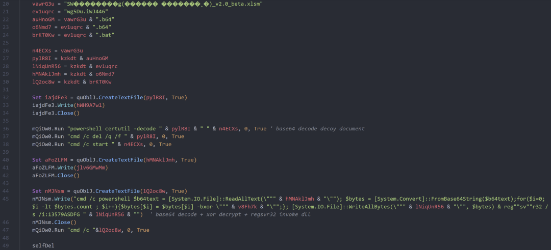 VBS代码首先base64解码诱饵文档数据,将其释放后打开,再经过解码并按字节异或0x8d解密得到DLL数据,保存为文件”wg5Du.iWJ446”,通过如下命令启动DLL,最后执行自删除操作清除VBS文件。