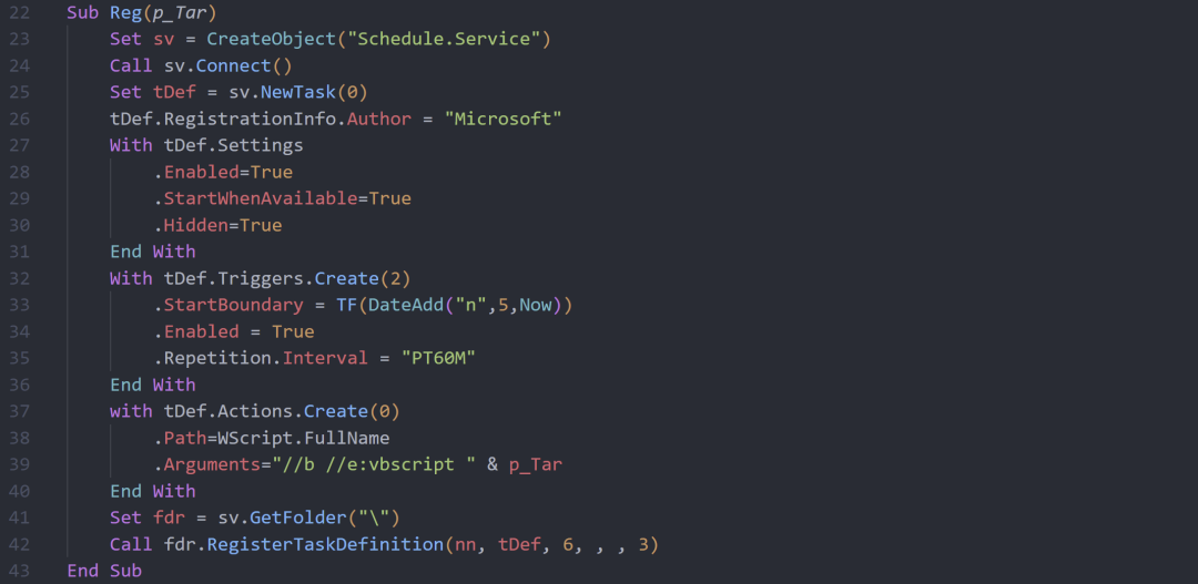 文件内容写入后,调用代码中的Reg函数注册计划任务,从而执行上述被释放的VBS脚本。计划任务以”Microsoft”的名义创建,在5天后开始执行,执行间隔为60分钟。
