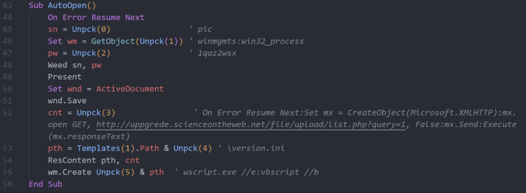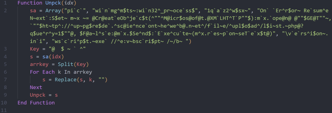 在文档的宏代码中,函数Unpck通过字符替换恢复所需的字符串。
