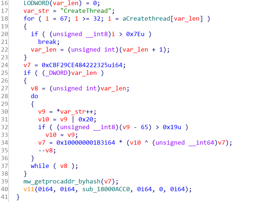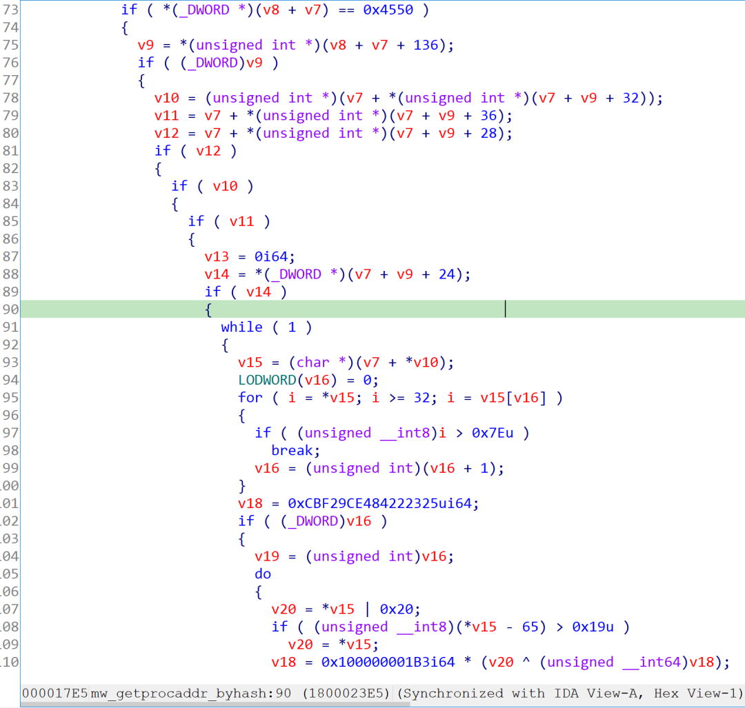 后门DLL获取Windows API时,先计算函数名称的hash值,再通过该hash值在进程加载的DLL模块中查找API,避开了对GetProcAddress的调用。