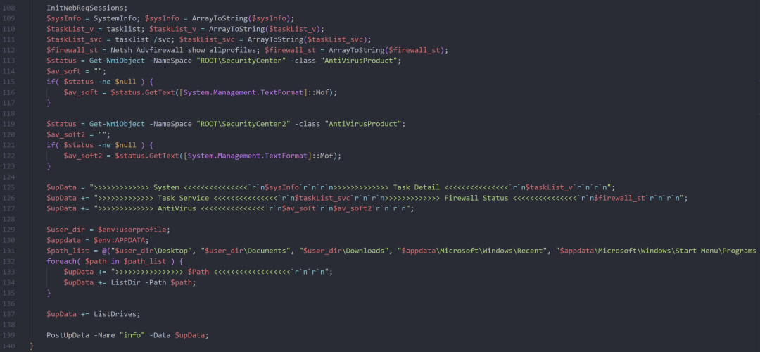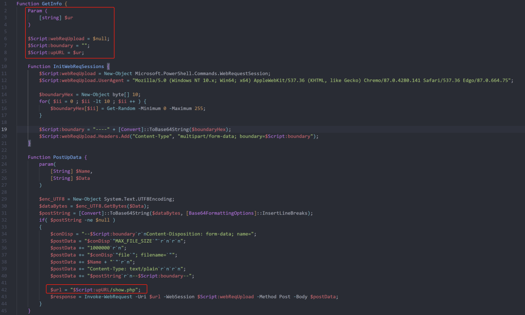 从Lib.php下载回来的是Powershell脚本,脚本的模块名称为GetInfo,有一个参数”ur”,表示通信URL。