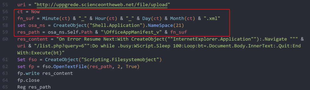 拉取的后续载荷依然是VBS代码。代码首先在templates目录下创建一个以”OfficeAppManifest_v[minute]_[hour]_[day+month].xml”格式命名的文件。