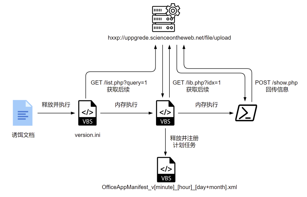 一旦启用诱饵文档中的宏,样本将会向C2服务器请求后续载荷,收集受害者机器的相关信息并上传,攻击流程如下所示。