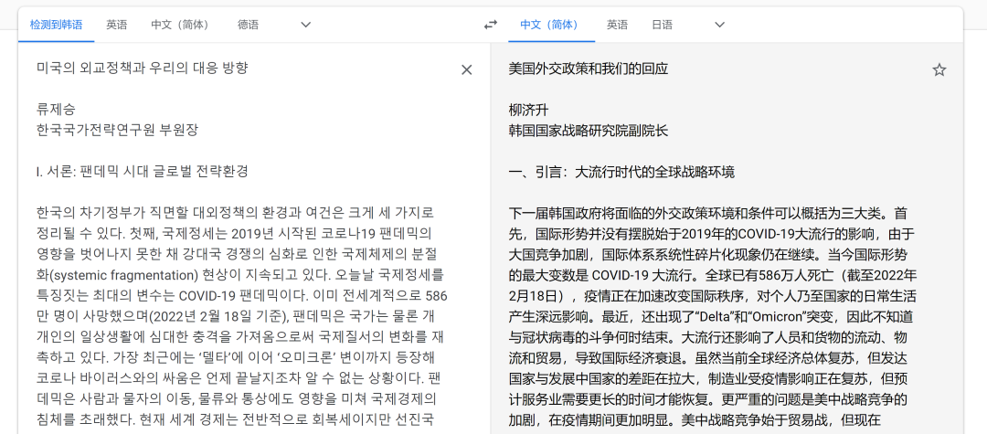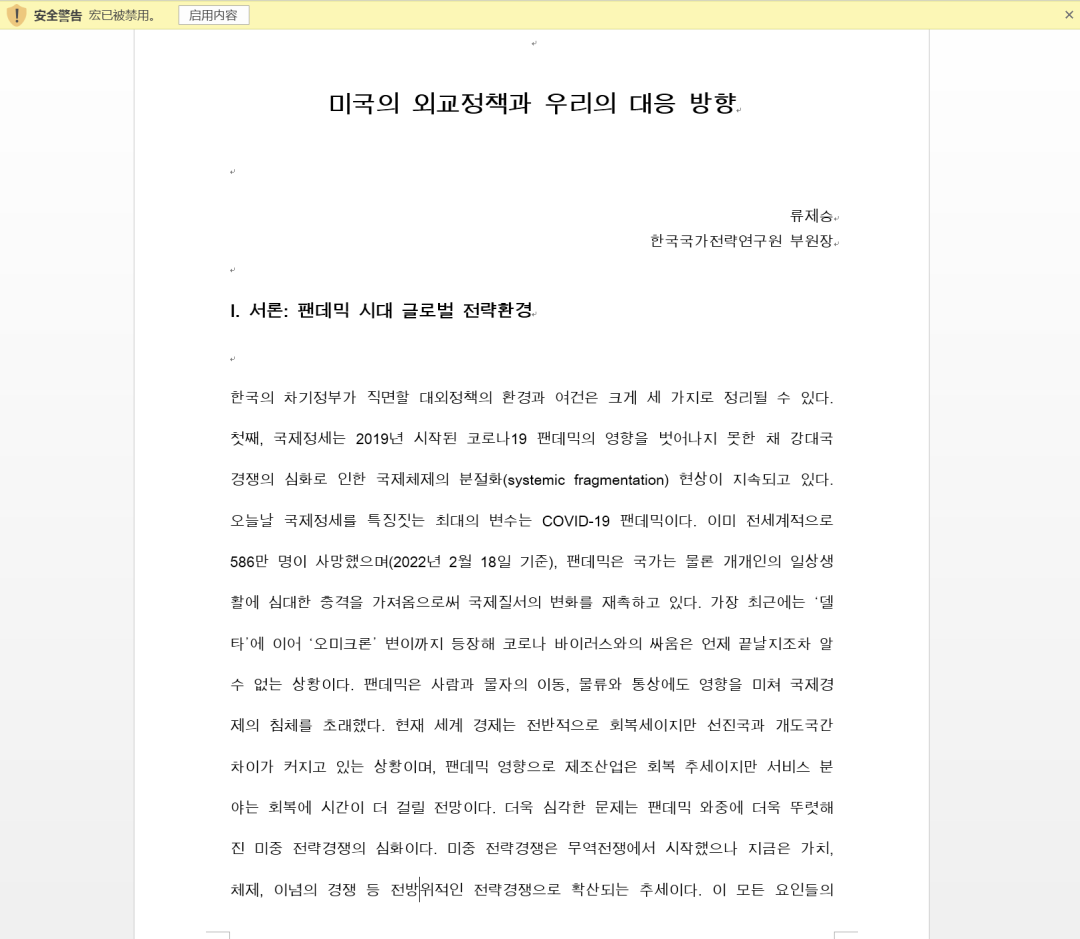 文档打开后展示内容如下,根据内容可以看出报告来自韩国政府智囊团,这份报告很可能是Kimsuky在之前攻击活动中窃取的文件。