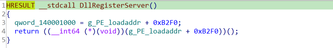 因为加载器DLL是通过regsvr32.exe启动的,所以它的导出函数DllRegisterServer也会被调用。该函数会调用被加载DLL偏移0xB2F0处的函数,而这个偏移值是被加载DLL的DllRegisterServer导出函数所在位置。