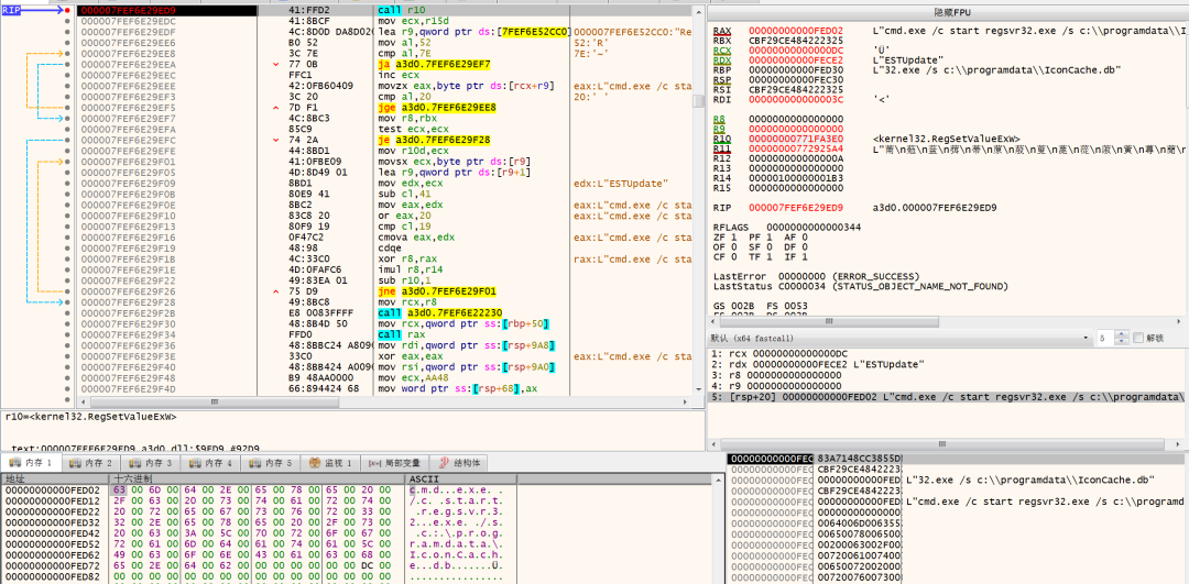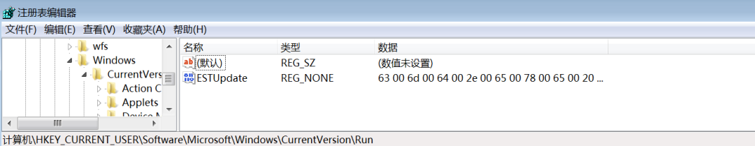 DllRegisterServer通过设置注册表HKCU\Software\Microsoft\Windows\CurrentVersion\Run键值实现持久化,值名称为”ESTUpdate”,对应的命令如下: