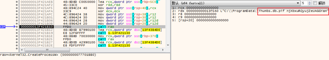 随后解密出下一阶段Thumbs.db.pif的启动参数njXbxuRQyujZeUAGGYaH并启动执行。