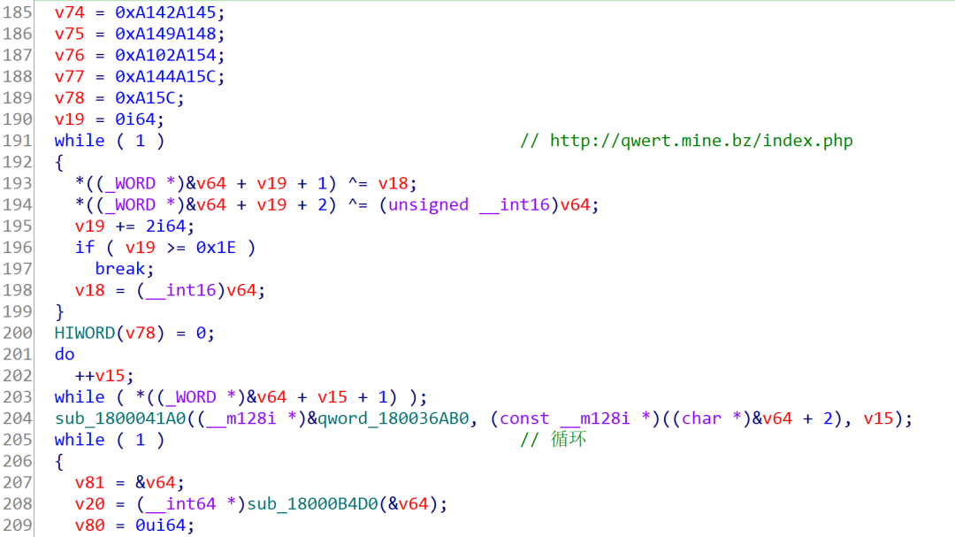 入口点函数通过CreateThread调用sub_18000ACC0开启与C2服务器通信的线程。先恢复出通信的URL:hxxp://qwert.mine.bz/index.php,然后进入循环。