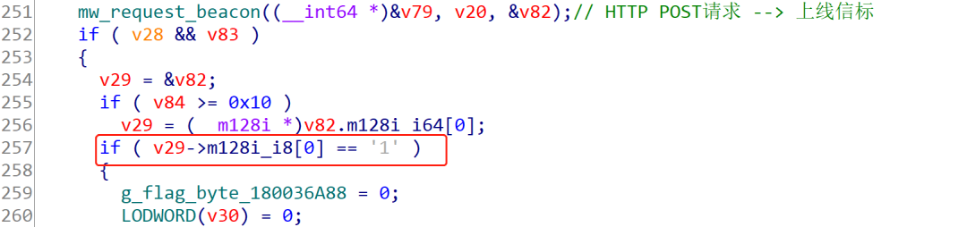 在循环中,线程首先向C2服务器发送一个POST请求作为上线通知,如果C2服务器有响应,且响应内容首字节为字符”1”,则继续进行后续操作,否则休眠3秒。
