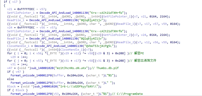 样本读取文件自身数据,异或解密后在C:\ProgramData\目录下写入诱饵文件和后续载荷。