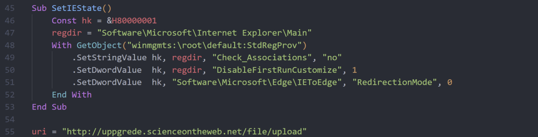 接着修改注册表中浏览器设置,从hxxp://uppgrede.scienceontheweb.net/file/upload/lib.php?idx=1获取后续并执行。