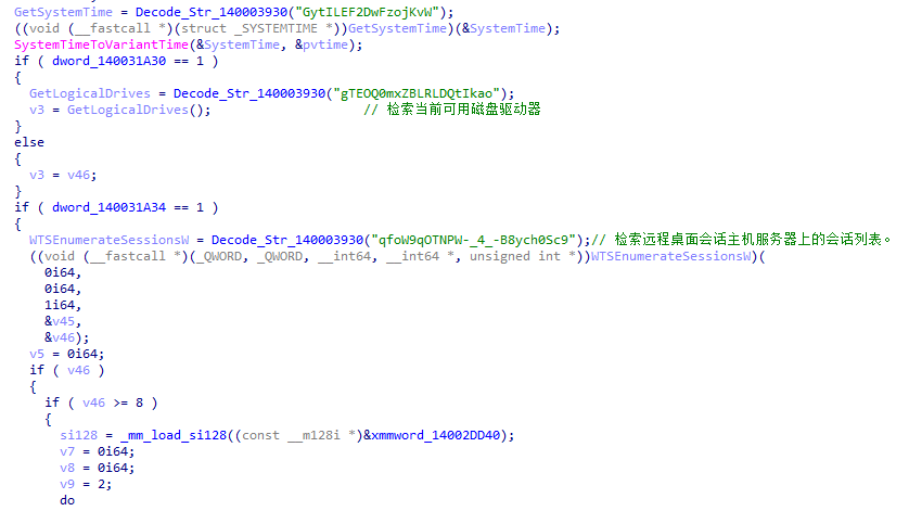 值得一提的是,样本使用GetLogicalDrives函数获取当前可用驱动器的数量,然后周期性地感知数量的变化。使用WTSEnumerateSessionsW函数监测目前被激活的会话数量,如果有更多的用户登录到感染系统,或者使用RDP进行原始访问,会监测到会话数量的增加,进而更改全局变量的值以执行命令。
