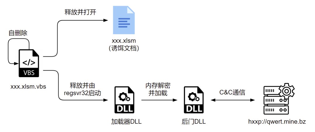 该样本在运行后会释放带加密保护的诱饵文档,同时在受害者毫无察觉的情况下加载一个轻量级后门,执行流程如下所示。