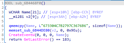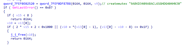 木马运行前会使用互斥体“9ABKD3409ABACL6SGHDG404HNJ0”控制唯一实例运行。
