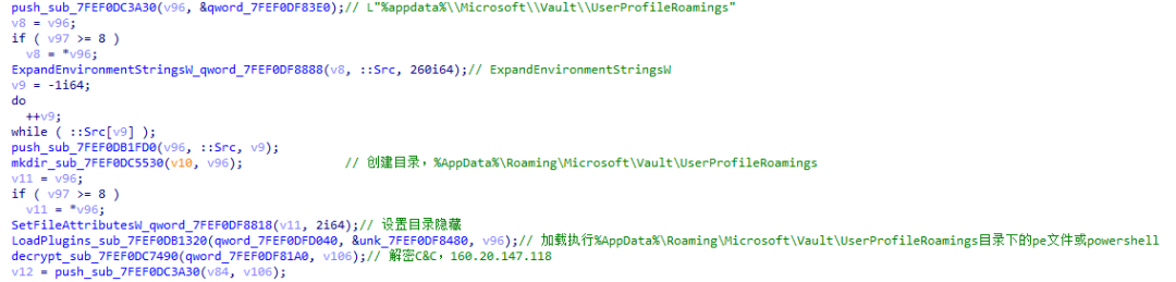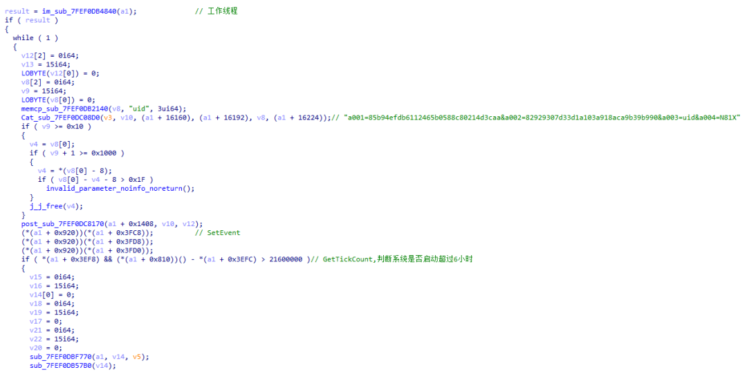解密C&C 160.20.147.118。先发起 https://api.ipify.org/请求,获取公网IP。收集主机及用户相关信息进入核心木马工作逻辑。当检测判断系统启动超过六小时后,主线程进行C&C上线,设置十分钟心跳间隔,并通过事件对象信号调度工作线程。