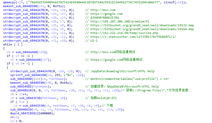攻击者用于攻击载荷托管、C&C通信的网络资产包括公开免费的云端存储站点(如bitbucket.org、statcounter.com)和攻击者私有C&C资产。木马回连地址会涉及这两类的多个url地址。