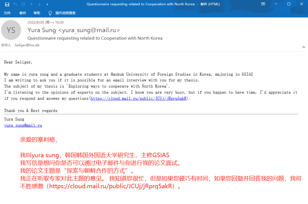 2022年6月20日,投递到[email protected]的鱼叉邮件如下所示,攻击者伪装成韩国在校研究生论文答辩事宜,诱导目标人员下载托管在cloud.mail.ru上的恶意文件。