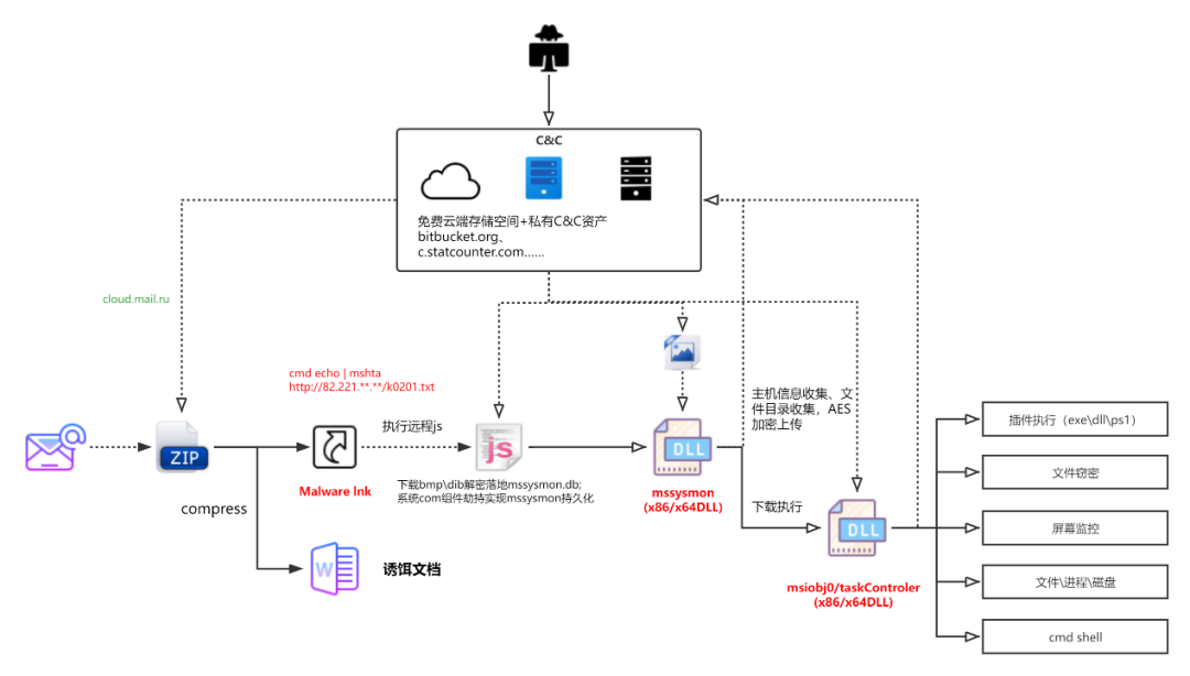 攻击事件中载荷执行流程如下所示,从下载落地的压缩文件开始,落地载荷可分为三部分:具备恶意下载的Lnk文件,具备文件信息收集以及下载执行的下载器木马(mssysmon.db),具备文件窃密、插件加载、shell功能的远控木马(TaskControler.dll)。后续部分将针对三类组件展开分析。