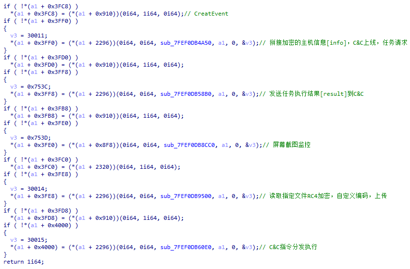 工作线程由独立的五个线程组成,分别完成相应的任务请求、结果反馈、屏幕监控、文件窃密、RAT等功能。