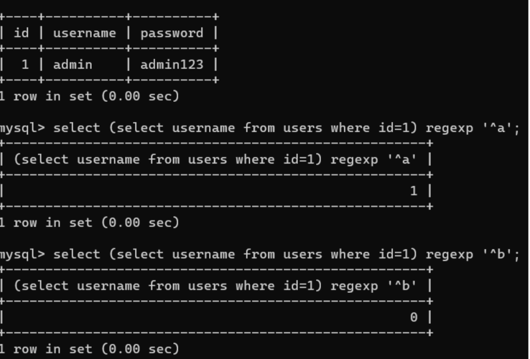 (1)正则注入匹配select查询结果,若匹配到结果则返回1,未匹配到则返回0